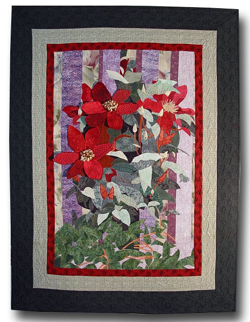 Blooming by the Weathered Fence - This quilt recreates a very simple photograph of some flowers against an old wooden fence. The background of the scene is done with piecing. The flower and petal details are “puzzle pieced” appliqué. I wanted a few of the blooms to be more prominent so each petal is quilted separately. The centers of the flowers are knotted pieces of yarn to give them texture. I utilized commercial cotton fabrics in this piece.