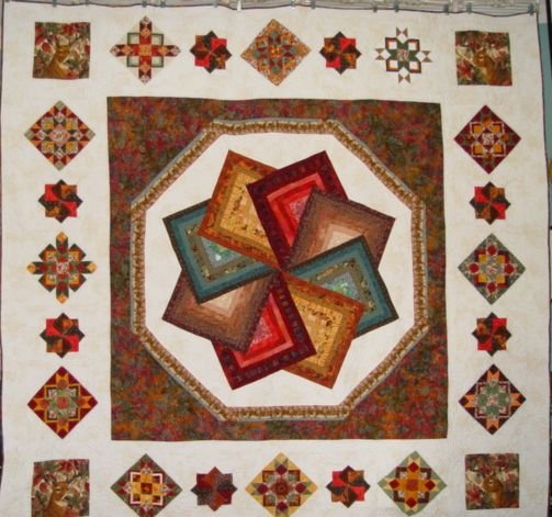 quiltnc Autumn Wedding - The border stars were from a "Sharyn Craig Challenge" in which 14 of us made the same block using a provided fabric and any other fabrics of choice. When I saw that the theme fabric was in autumn colors, I decided the finished quilt would be for my oldest son and daughter-in-law. They had to wait for the deadline for the finished blocks. Then I pieced the quilt using parts of the Amish Spinning Star pattern and a fabric with deer and autumn leaves. This is a large king-sized quilt.