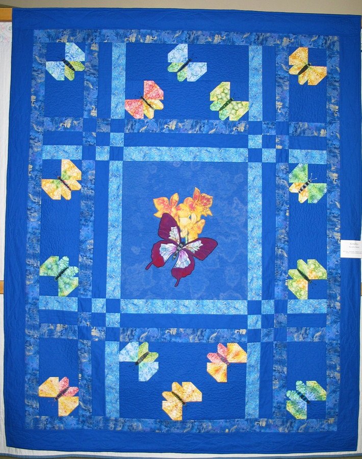 ButterflyBev Butterflys - I started with the center block. My husband made me a stained glass window with the butterfly pattern. So I decided to make a quilt to go with it. Then I made the butterflys around the edges from the book stack-n-whackier quilts. I used my hand died fabric for the center butterfly and the backing.