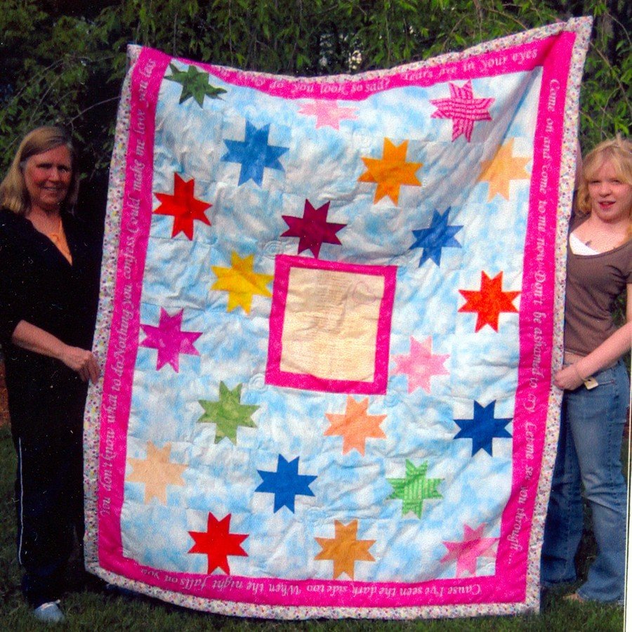 dollaremylife Kendra's friend - Used a star pattern from the Ouilt Loft for the main body of the quilt Embrodiered a poem written by Kendra for her friend in the middle of the quilt then around the border I embrodiered their favorite song, the back was a whole cloth and the label was embrodiery written by Kendra