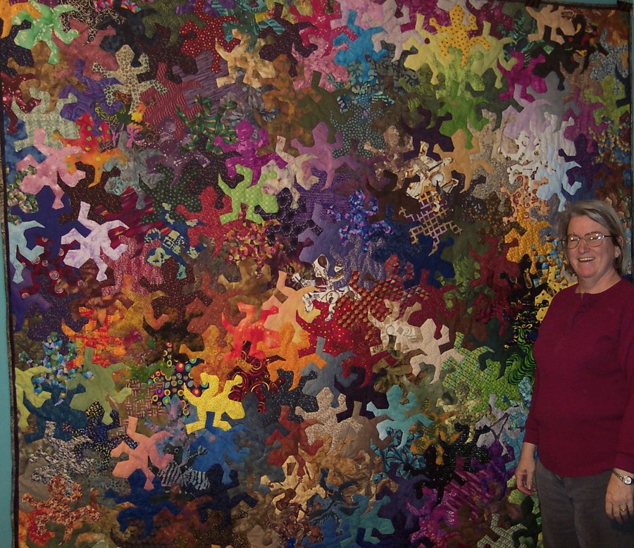 Nerak Art Gecko - renamed by owner "MINE!" - I have had his project in mind for over 10 years, been collecting "lizard" fat quarters forever. I have 270 different lizards in the final 7'x7' quilt. It's applicae/hand pieced with papers basted to the back of each lizard for alignment on a light table... FINAL STATUS: quilt finished and delivered, she squealed for five minutes and declared it "MINE!" and slept under it that night.