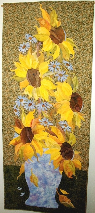 elsiequilts Sunflowers and Asters - I wanted my quilt to look like a painting so didn't use the dark background typical of others in Phil Beaver's lively class. I did the sunflowers first, then realized it needed something more so added the blue asters, then heavily quilted it. I really enjoy this "painting" that now hangs in my home.