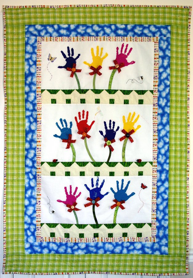 kelleyc The Garden Club - There are actually two quilts, each containing the handprint of my daughter and her preschool classmates. These were made as end-of-year presents for her teachers. They took WAY longer than I anticipated. Her class was called "The Garden Club" and so the handprints are all meant to be flowers in a garden. I started out with an idea based on a book by Marcia Layton, but then I saw the Simply Quilts episode with Lynette Jensen of Thimbleberries making a tablerunner with a picket fence, and thought that would look cute too.