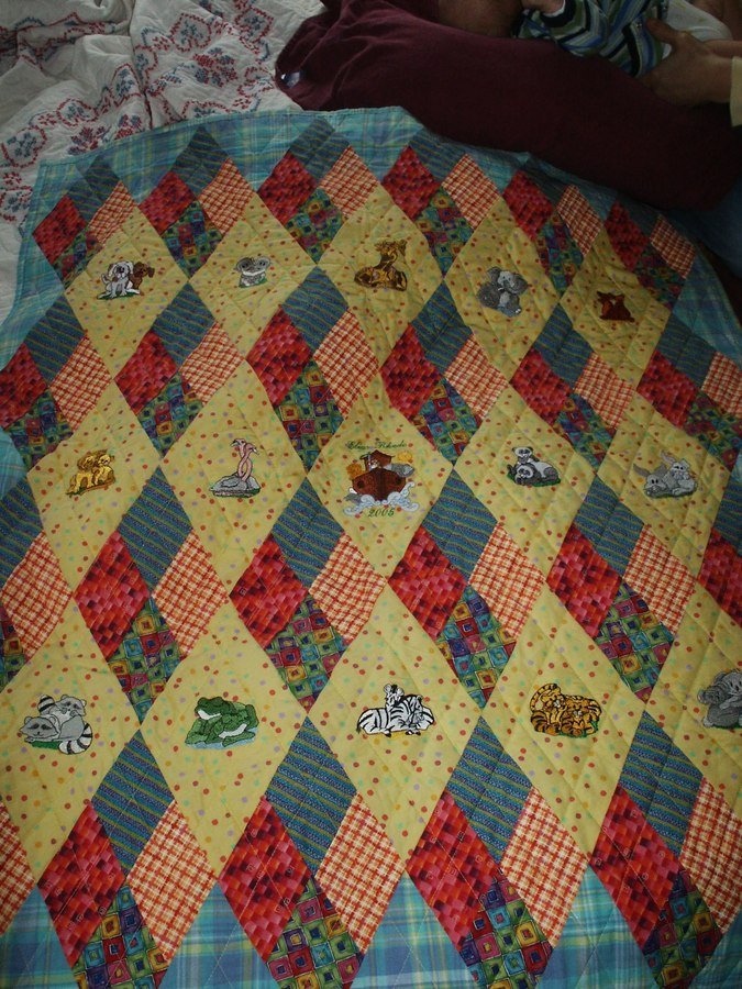 | Design Source - Description | Made for the first born grandson. Embroidered with a Noah's Ark theme. The boy is now 2 1/2 and likes talking to the animals at bed time. |