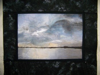 taramail Calm before the storm - After taking Painted Landscapes with Michele Scott from Quilt University, I completed this quilt from a picture I had taken at a lake we live near. I then entered it in the QU Virtual quilt show to which it won an honorable mention. The painted fabric is machine quilted with various colored threads. Border fabric was also painted by myself.