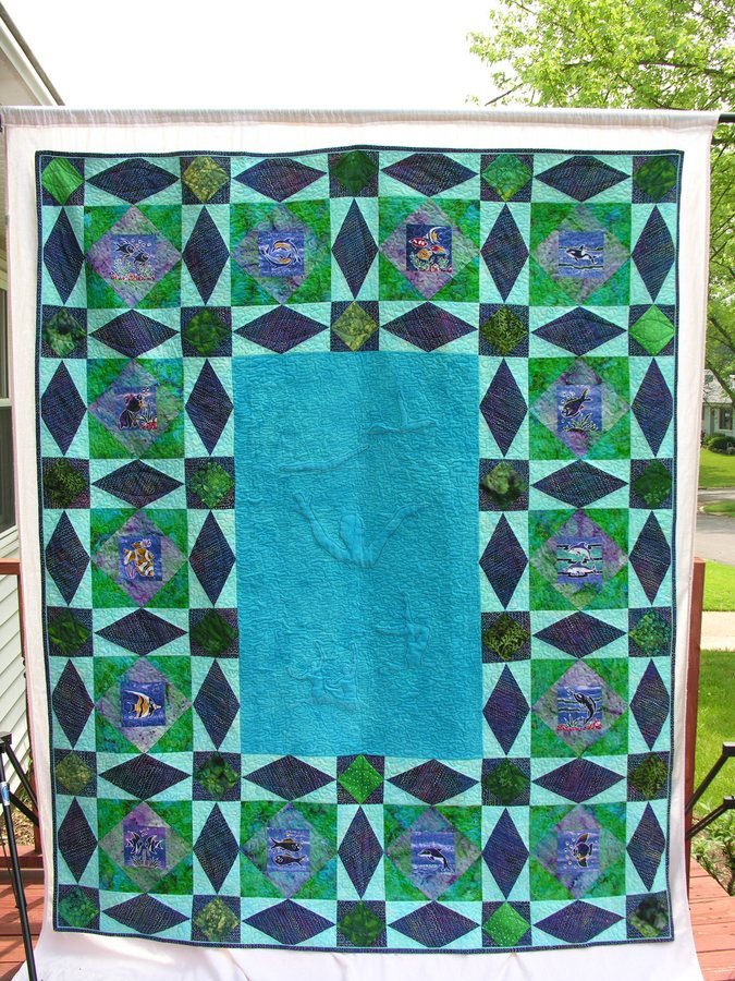 ckbellneville Swim Up a Storm - Made as a raffle quilt for a synchronized swimming team. The center panel features silhouettes of swimmers done in trapunto mock bobbin work with Razzle Dazzle. Fun quilt but alot of work. 100% cotton. Cotton and poly thread. It now belongs to a synchro swimmer in IL who is going to Nationals!
