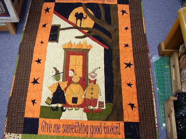 | Design Source - Description | This is a preprinted panel by Sandy Gervais. It was such fun to qult. Her complete line of fabrics to go with the panel are showcased on the back. It is quilted with all things Halloween. |