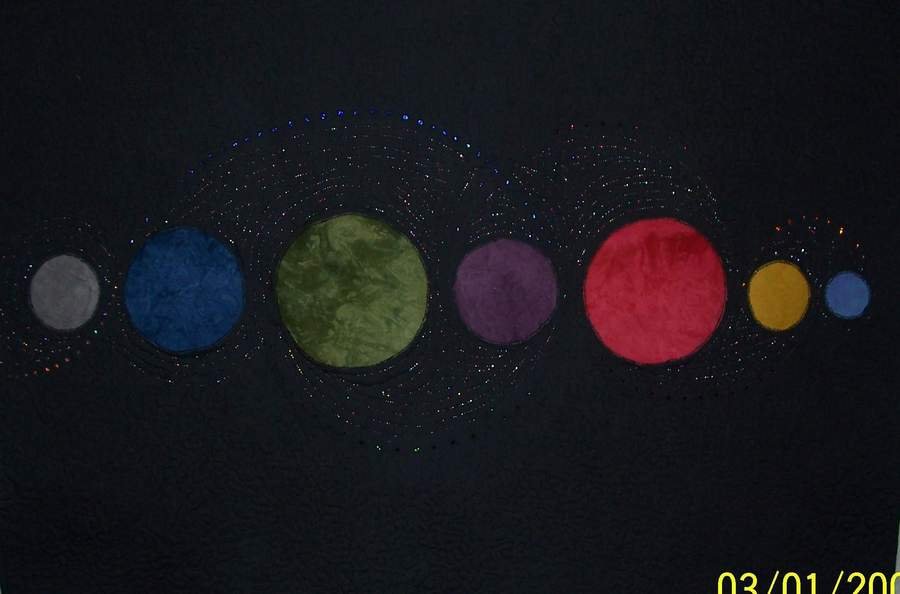 ShelleyAnn Ring Galaxy - Designed, sewn and quilted by Shelley Ann using commercial black fabric background and self dyed fabrics. Embellished with metallic thread and Swarovski crystals.