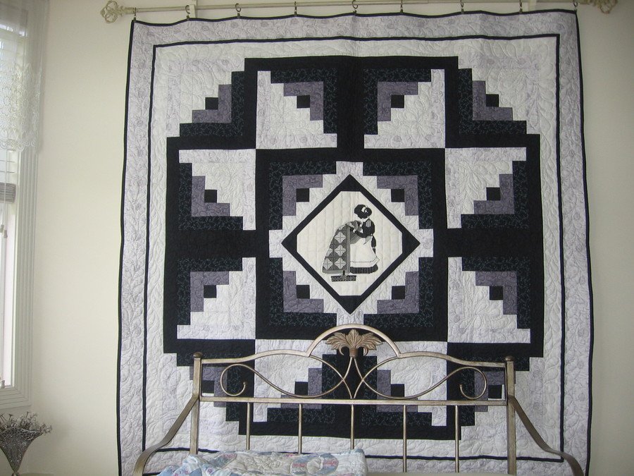 | Design Source - Description | Center of Log Cabin star has a hand made counted cross stich design of a quilter working on a log cabin quilt. |