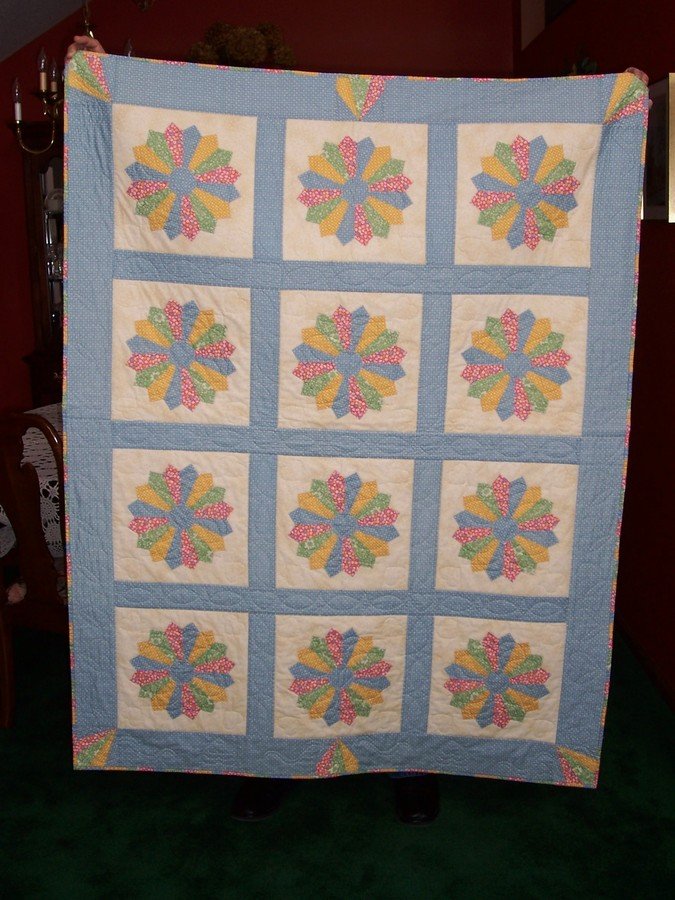 | Design Source - Description | Traditional Dresden Plate using 30's Reproduction Fabric to commemorate a 50th Wedding Anniversary. Designed on EQ5. |