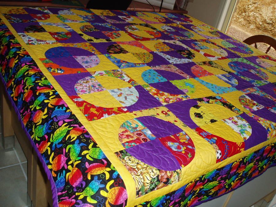 lduhig Rebecca's Quilt - I'd previously made a similar quilt for Rebecca's older brother (Josh) when he was born and had initially intended making his in all novelty fabrics. When I couldn't make the light/dark thing work with so many fabrics I substituted bright blue and lime greens for every second quarter circle and quarter background. So when Rebecca was born ... they were waiting. Josh's quilt had the blocks on point and freehand spirals and zig-zag quilting (as did the original design in "Quilts for Kids". For Rebeccas the blocks were "straight" and the quilting more formal - feathered wreaths and crosses.