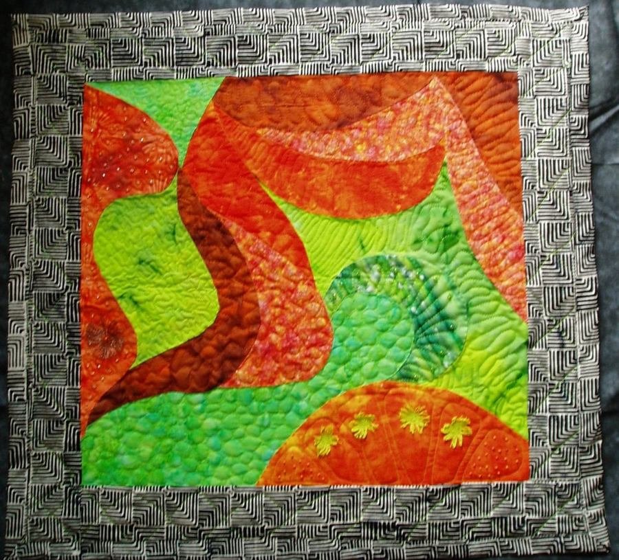 jquiltie Calliope - The design was hand drawn. The colors were selected after seeing them togehter in a paint job on a car. I love the way the colors played against each other. There were small string art pieces and beads added to the quilt after it was quilted.