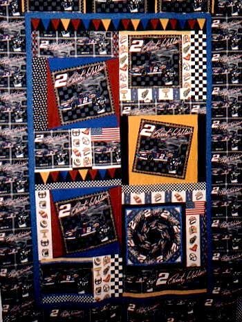 | Design Source - Description | Rusty Wallace was our grandson's favorite NASCAR driver. I designed around licensed fabric. The Sn'W block is to represent a spinning wheel. It is the only part that isn't entirely my design. |