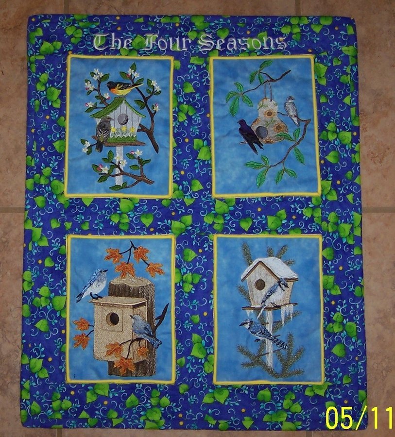 ShariK Four Seasons - Embroidered bird and birdhouse blocks one for each season. Each block is piped, borders & sashing stippled.