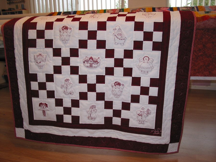 | Design Source - Description | Angel at Play in Redworks are machine embroidery, set in an Irish chain block. |