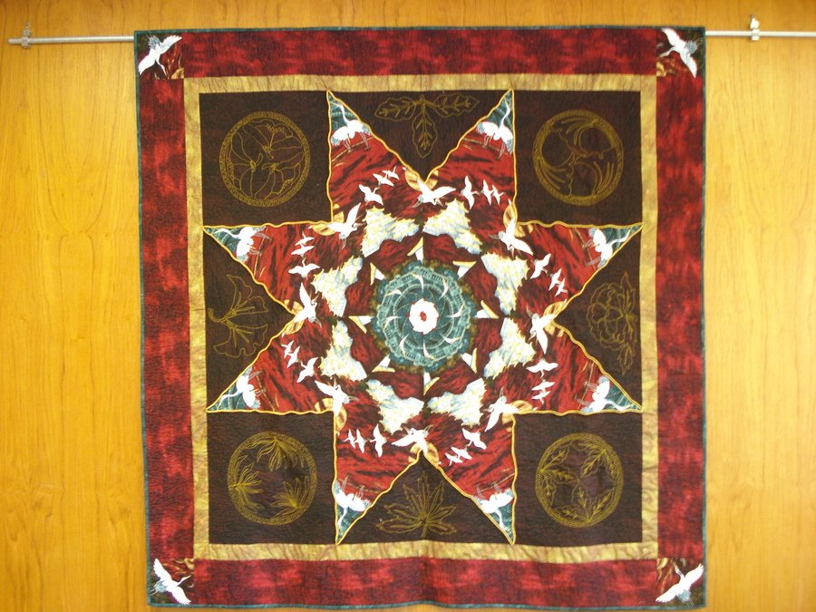 | Design Source - Description | Large Star quilt using Kona Bay Emporers collection. Machine quilted on home machine with 30 wt madeira and invisible thread. Traditional Japanese Crests are free motion quilted in the setting blocks. |