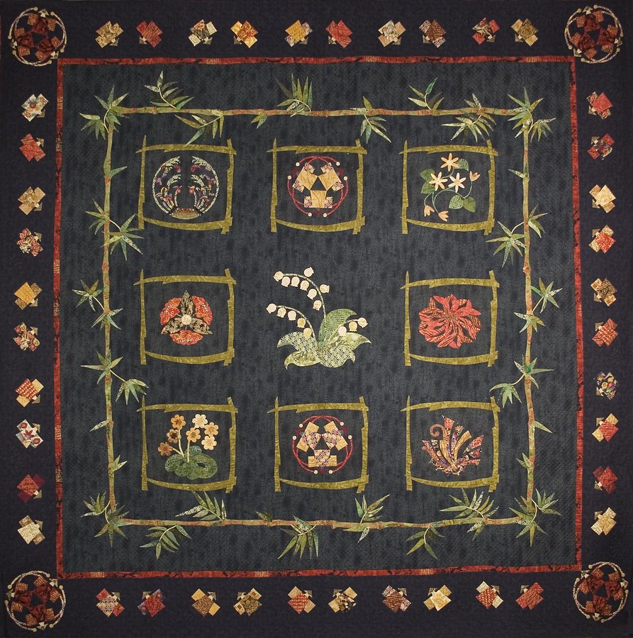 sewingbyjanet Geisha In The Garden - I loved the oriental fabrics and instead of doing blocks, my sister & I designed blocks using bamboo on one large piece of fabric. The designs inside the bamboo came from Kumiko Sudo's book. I finished it with Geisha around the border.