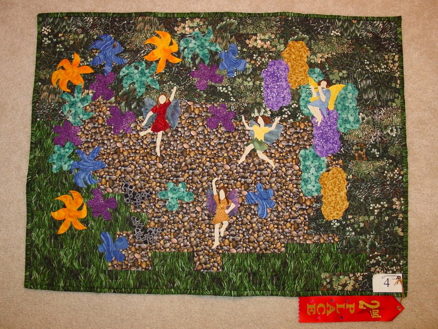 NorthernValkyrie Garden Party - Created for participation in guild challenge. Background is machine piece with foreground objects applied via needle turn applique. This was my first applique project. Also my first project where I created my own design.