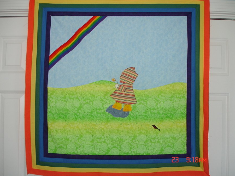 | Design Source - Description | Sunbonnet Sue with flower on grass with rainbow in sky. Surrounded by rainbow border. |