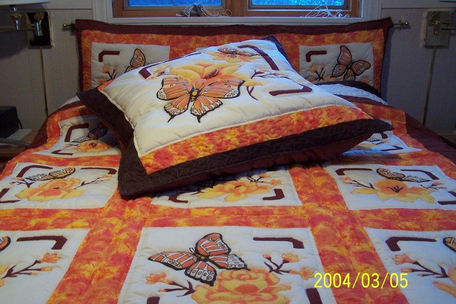 denbigh49 Butterfly - Hand painted sqs made into large Queen size quilt , matching pillow and Head board also.