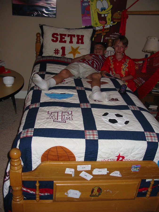 Joquilter Sports quilt - Living near Houston ,Tx. I wanted to make my grandson a sports quilt with the Texans, Astros & Rockets logos. Since my son-in -law graduated from A&M, & We had University Of Texas, I used there logos also on the quilt. Had to do a lot of research & thanks to my Bernina embroidery machine the quilt was made.