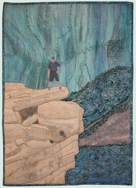dianedidit Hi Mom! - Whole cloth (dupioni silk) dye painted. Rocks were drawn and colored with Caran d'Ache Neocolor crayons, then thread painted and quilted separately on another piece of beige silk and appliqued on. Figure was printed from the original photograph and fastened to the piece when finished. Background has been highlighted with Jaquard fabric paints and Neocolor crayons in places.