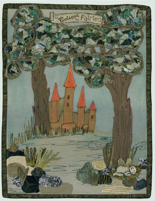dianedidit I Believe in Fairies - Whole cloth (cotton/linen blend), painted. Tree leaves were made using the snippets technique. Fairy was made using a suede-like upholstery fabric, with angelina wings.