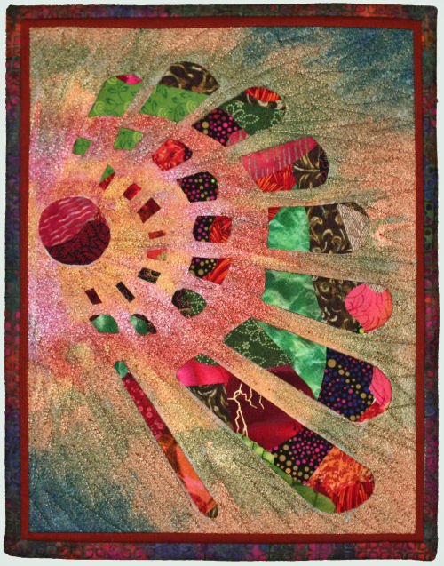 dianedidit Perspective - Materials/Techniques: I was at a retreat and somebody had brought a bag of pre-fused scraps. I had some handmade paper with me and wanted to see if the texture would come through fused fabric. It didn’t. SO, I was left with this pretty 8.5”x11” sheet of fused fabric scraps. I was reading “Creative Quilting: The Journal Quilt Project” and saw a piece where somebody did reverse appliqué and I liked how the color of the background fabric came through. However, instead of fabric for my top layer, I used (Lumiere paints) Peltex, on which I traced and then cut out a pattern from a photo of a circular staircase. Quilted with mono filament on top (gold poly on back), bordered and backed with a commercial solid, bound with commercial batik.