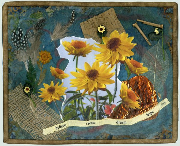 dianedidit Sunflowers of Hope - Materials/Techniques: Silk fusion, feathers, burlap, metal, wood, ribbon, photographs, etc.; mixed media collage.