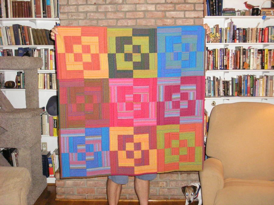 Virginiareader Kaffe Fassett Fabrics Beauty - I bought fat quarters of these fabrics at my favorite quilt store, now closed, In the Beginning, in Seattle, WA during a visit to my daughter's. I love the stripes and plaids, and have it hanging in my living room on the brick wall above our fireplace. It complements the terra cotta paint on our living room walls.