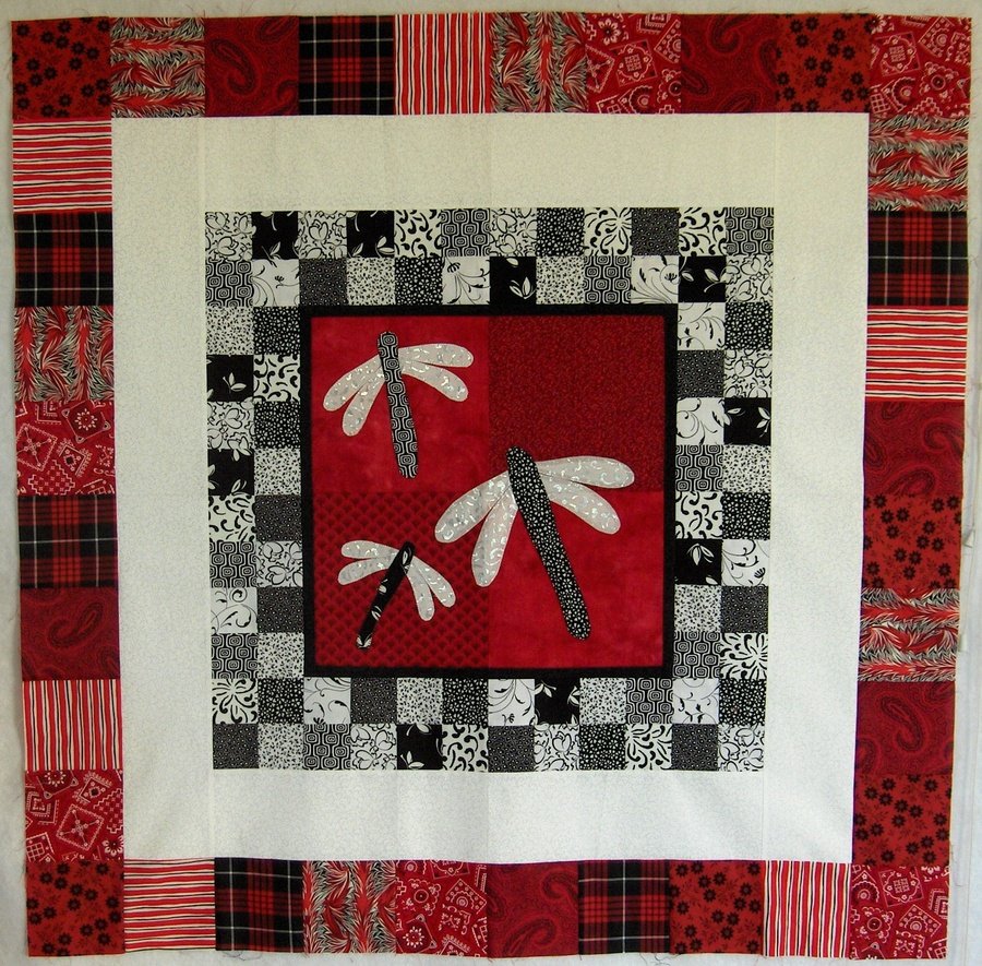 kayahr Dragonflies - I joined Pat Sloan's Round Robin Swap (Yahoo) Group. This one is a DIY - Do It Yourself Round Robin. The center is raw-edge applique with a machine blanket stitch.