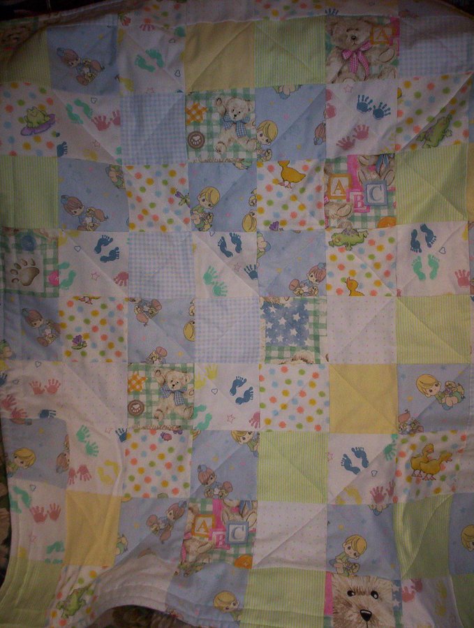 Kimandmush Baby No Name - I took left over pieces of baby flannels, cut approximately 4" blocks and sewed them together. I met this young woman while in hand therapy who's family was not there for her. She and her husband were expecting their first child and were basically alone. I wanted to show her that people do care and God loves them, so I made her a flannel quilt for her yet to be born baby. I pray they are all healthy and happy.