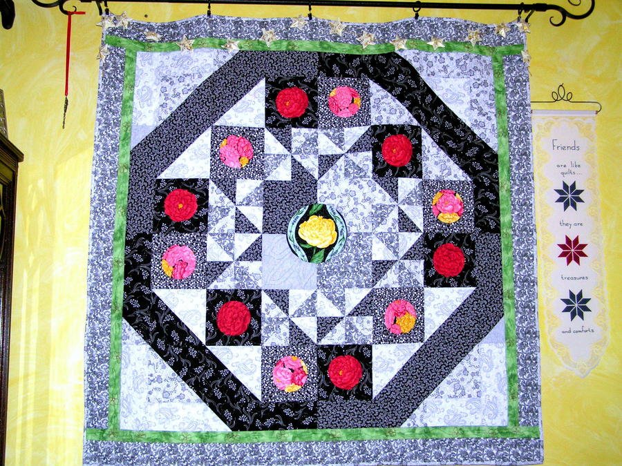 joanne94w Garden Path - I created this design to use the pieced circles that I wanted to try. The machine quilting uses silver metallic on the black background and cottons on the rest.