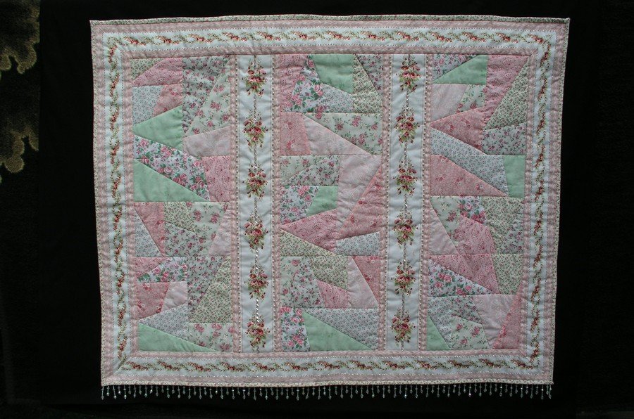 | Design Source - Description | The second in a series, crazy patch rows with a border print between. Embelished with pearls, seed beads and bugel beads. |