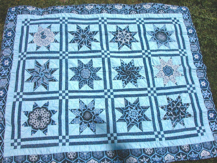 vampyrmom Blue Stars in Winter - This quilt was made using the Stack and Whack technique. The way the fabric is cut creates the different colored star patterns. Each one is different. I used a lighter blue fabric that had various gradations in color and then a white dotted dark blue fabric for the sashings. The outside border the fabric used for the stars.