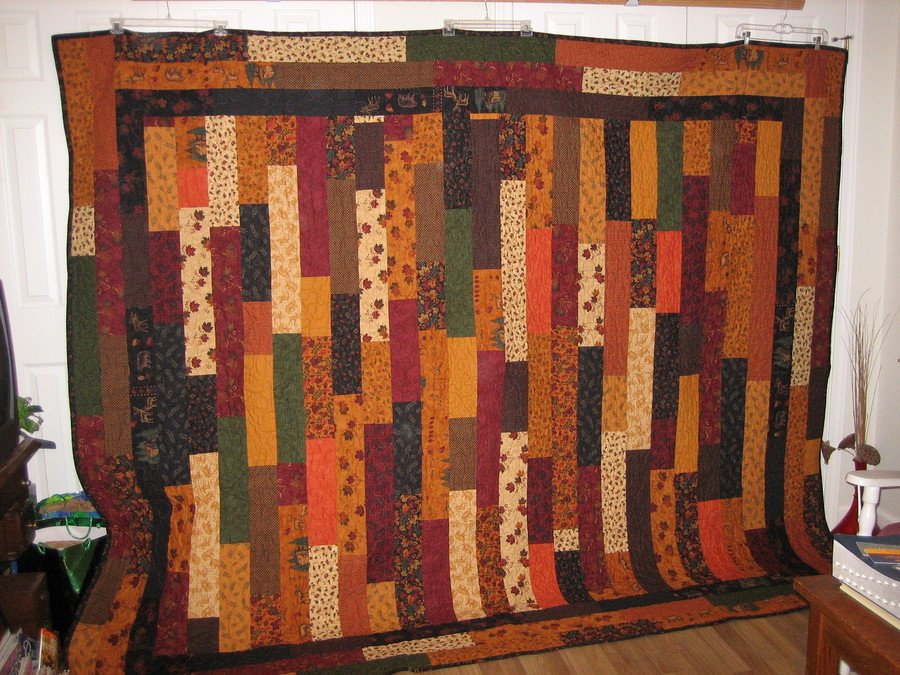 momoffour Lasagne - Bright, fall colors with outdoorsy theme (bears, trees, leaves, cabins). Given to teenage grandson who LOVES to eat (quilt is named Lasagne) and he also loves the outdoors, hunting & fishing.