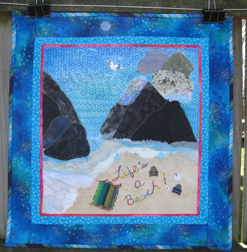 needlepointernc Life's A Beach - One of a series of 4 quilts done in a class with Linda Schmidt at www.quiltuniversity.com. The class is called Elements. This is the Water Element. It is based on a picture I took in Bermuda on our Honeymoon in 1992. It has beads, fused rocks, and the water is made from painted cellophane that was heated. Then I covered it with organza. I then added sequins to look like buble.