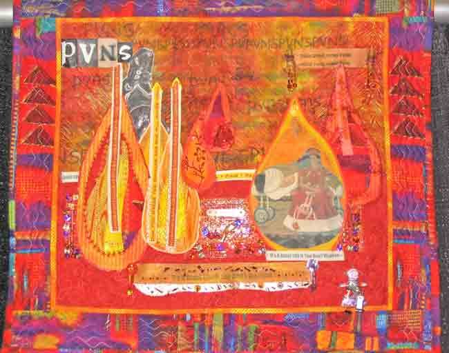needlepointernc It's A Great Life If You Don't Weaken - This is one of a series of 4 quilts made for a class with Linda Scmidt at www.quiltuniversity.com called Elements. This is the Fire piece of the series. It is based on paintings by Frieda Kahlo. The movie Frieda came out around the time I had my first hip surgery in 2003. Frieda had a bad accident and lived in pain her whole life. One of her paintings is of her left foot painted from her angle while lying in bed. I just happened to have taken a photo of my right foot the same way while I was recovering in bed. You can see my right foot in the upper left. There is a photo print of part of one her paintings in one of the flames. The flames represent the pain.