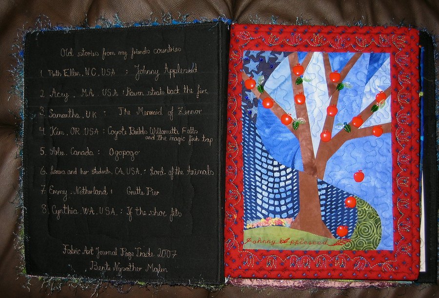 needlepointernc Johnny Appleseed Journal Page - A journal page done for an exchange that I did through the Internet with 8 other fiber artists. This page was done for Bente, who lives in Norway. She wanted pages that represented a fairy tale from your home country. I chose the story of Johnny Appleseed. This page has been selected to be published in a book by Dawn Sokol called 1000 Journal Pages. So, that is exciting. I haven't bound my pages yet. My theme was do something that represents where you live. I got some great pages.