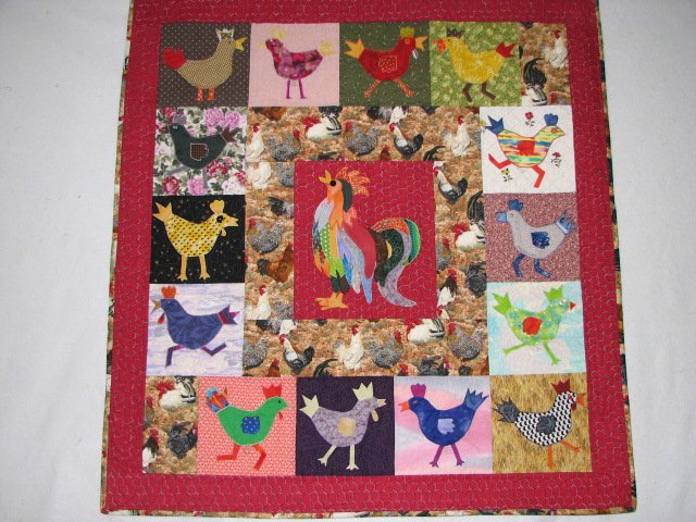 quiltsforever Rooster and His Chicks - I used Florine's pattern for the central rooster and my own design for the chicken blocks which were inspired by Gwen Marston's chicken quilts. The layout was my own design. Chicken wire fabric and printed chicken fabrics were used to finish this theme quilt.
