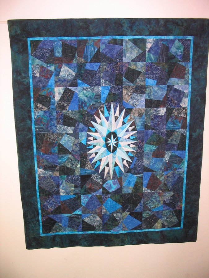 BethMI ?? - I made this quilt for my son's BFF ("best friend forever")'s high school graduation. On to college. What a great kid! These are all batiks in blue, gray and slight green. On the back, I used Ami Simm's Twisted Sisters on a background of blue green batik -- more woodsy theme -- with conversational prints making the blades of the block. I chose fabrics with meaning to the boys -- school buses, soccer, baseball, lacrosse, bikes, travels they took together, etc., and included photos at the bottom.