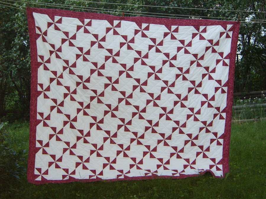 | Design Source - Description | Traditional pinwheel of half-square triangles using two fabrics, both commercial fabrics. I believe the pink fabric was a "Quilt For The Cure" fabric. |