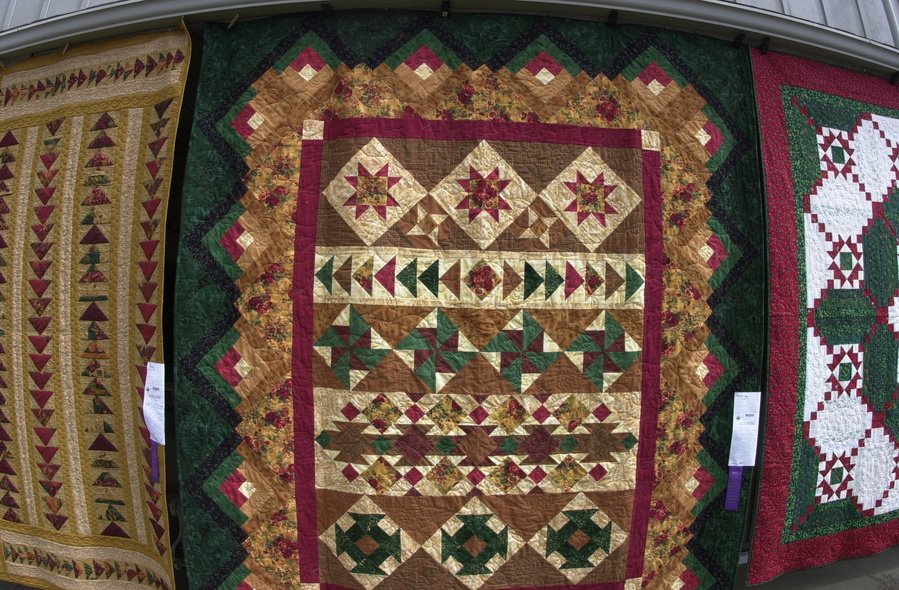 DarFar Cabin by the Lake - I made this for my bed thus the condition as it is well used. All in flannels and I live where it is cold in Northern Northern California. Problem is it is a queen size and I have a new king size bed so I put it on the bed sideways. My son took this pic with a fish eye lens (he is a navy photographer) It is hanging at the Sisters quilt show in this shot.