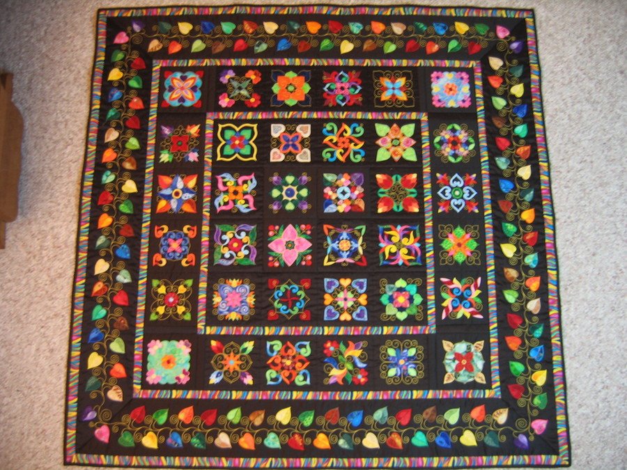 Manuelca The Magic of Color - Pattern digitized by Virginia Key and Bonnie Rosenbaum for BOM classes at Ann Silva's Bernina. Embroidery machine applique instead of by hand.