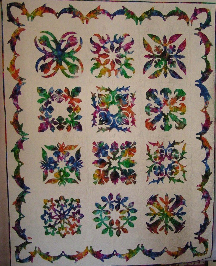 MargaritaW COLORFUL ALOHA - Purchased this batik fabric while on vacation, to make my Hawaiian Quilt. Had to send my Daughter-in-Law after more fabric 3 months later. as I only figured enough for the blocks. The store still had the fabric. Lucky me. I did needle turn applique.