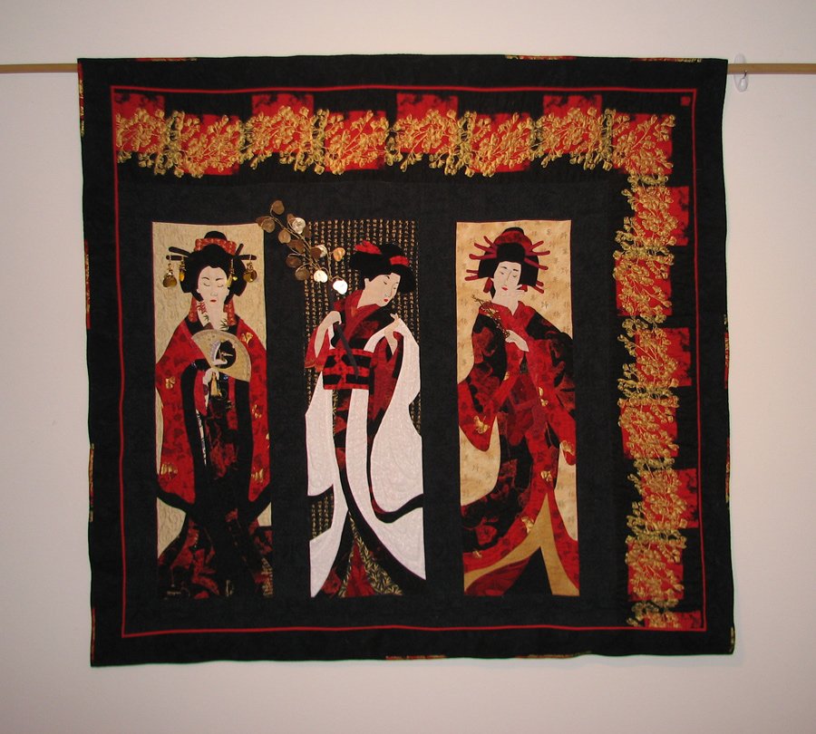 KDQuilts Gingko Princesses - This quilt was inspired by the fabric line from Loni Rossi and her princess patterns. I wanted to combine the three patterns into one larger quilt and use the gingko fabric for a border. The geishas are hand appliqued and I added gold embellishments.