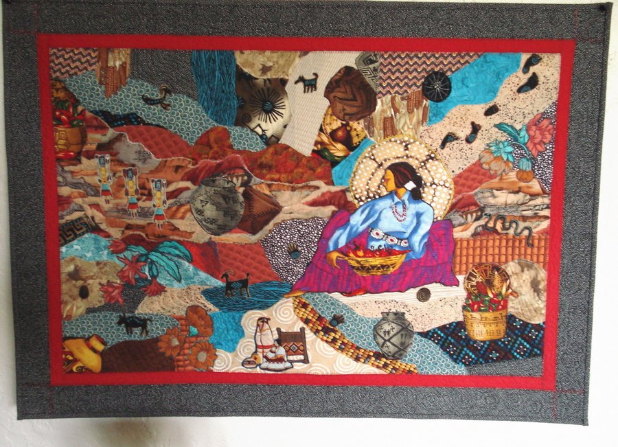 Sharics Na ashjeii Asdza "Spider Woman" - I took a class from Santa Fe Quilting on Fabric Collage. We used Rosemary Eichorns' The Art of Fabric Collage as a resource. The fabric was old and new fabric from my stash. I discharged the fabric behind Spider Woman's head. The RC Gorman style woman was a piece of AH fabric that I bought years ago. She was just what I needed. Spider Woman is a Navajo figure related to their origin on Earth.