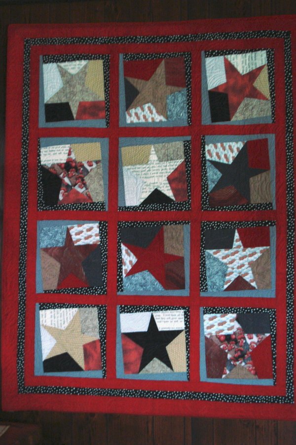 Sharics Which Came First- Chicken or the Egg? - This was a quilt thatI made in the Aztec Bee. Catherine Bell designed the block and how to move the fabric so that the star was all the same fabric. I fussy cut two of the stars using fabric of just chichen heads. My mother has a collection of chickens so I used my chicken stash to make her quilt to hang in our great room. We also have a wierd assortment of chickens that wonder about our place.