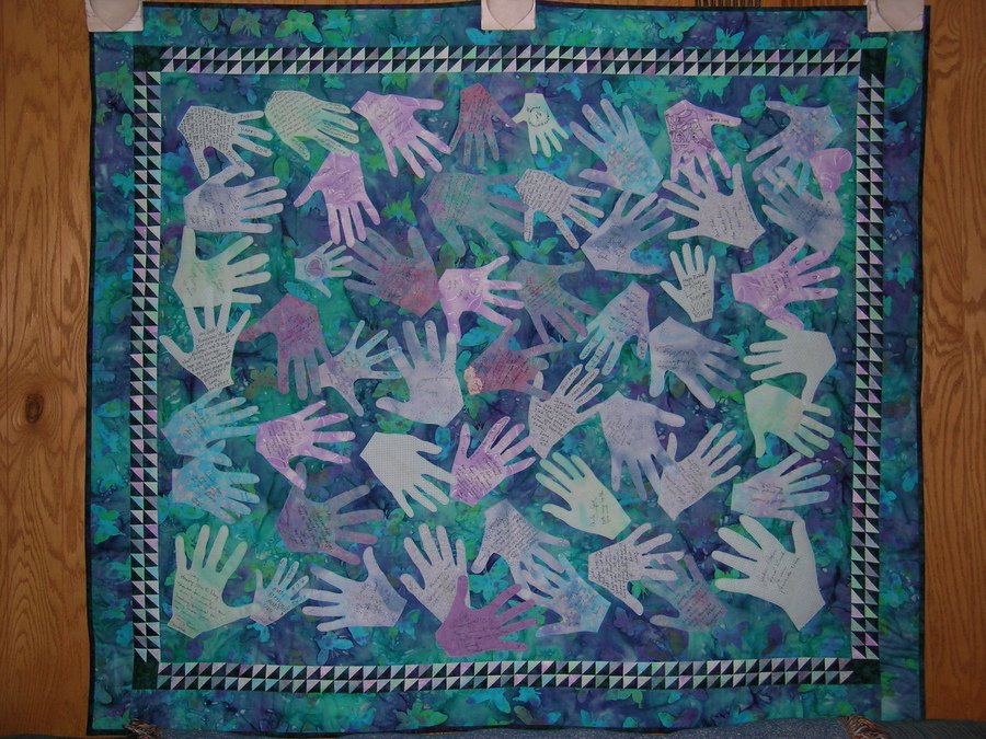 silverquilter450 Friendship hands of love--MY VERY FIRST QUILT - MY VERY FIRST QUILT--A memory quilt made of hands of the friends and family of the recipient for a 50th birthday gift. The background is made from batiks and the hands are various cottons. It has a sawtooth inner border.