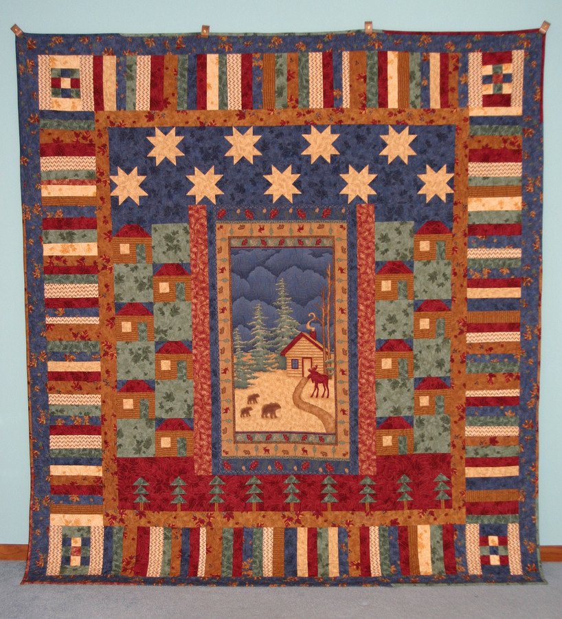 | Design Source - Description | Design incorporates various traditional blocks (Sawtooth star, tree, house) along with a printed center panel. Center panel and fabrics are from the Cub Lake collection by Holly Taylor for Moda. |